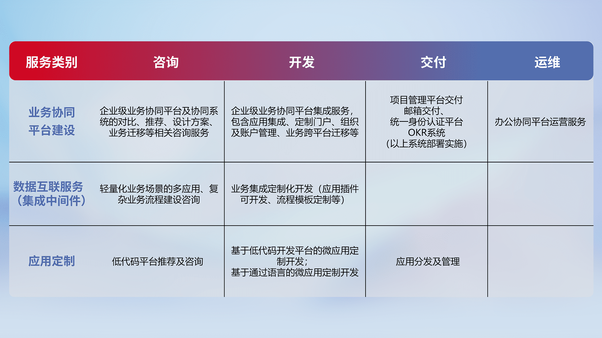 针对钉钉、、、企微、、IDaas等平台级产品提供产品的规划、、、方案、、、、交付、、定制化开发等服务,,,实现如统一协同办公、、、智能客户服务、、混合会议管理、、、、智能数据查询、、、等业务场景,,实现数字化转型。。。