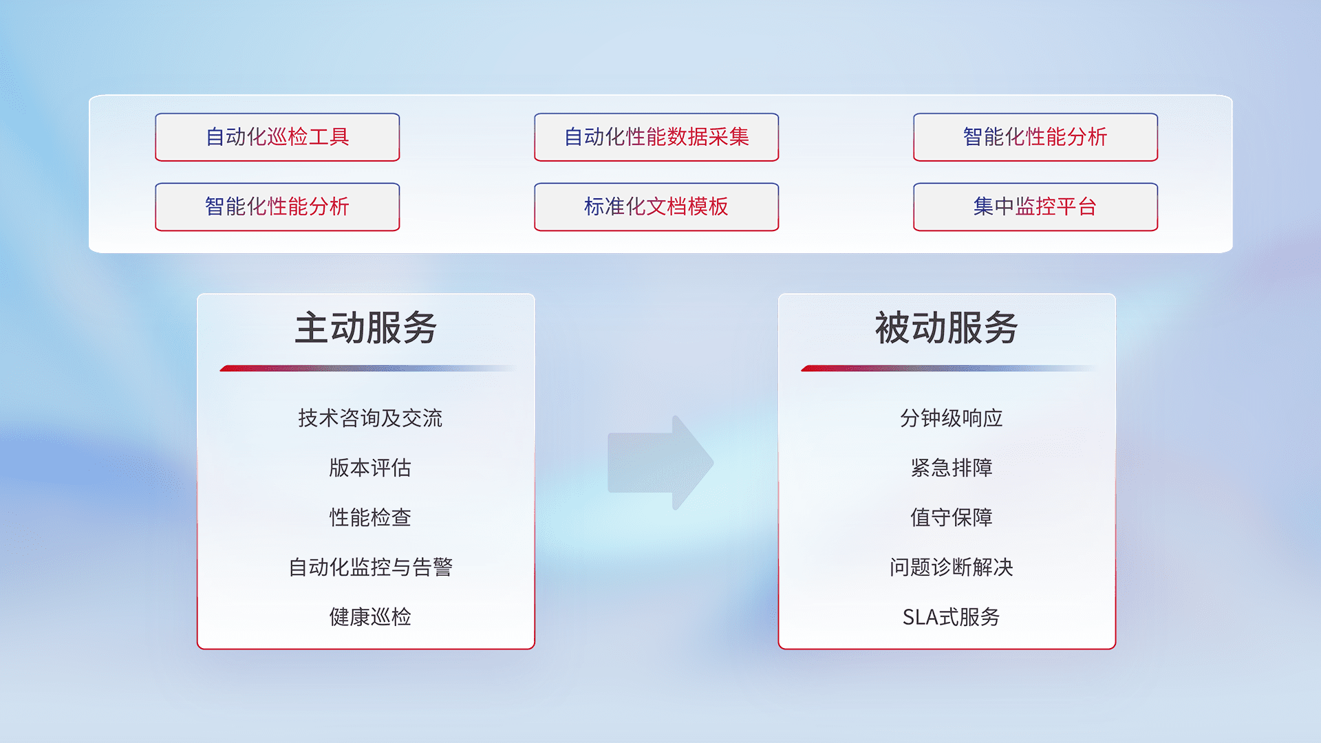 智能化工具和标准化文档,,,保障服务质量,,提供主动服务(包含技术咨询、、、版本评估、、性能检查、、自动化监控与告警、、健康巡检)和被动服务包含(分钟级响应、、紧急排障、、、、值守保障、、、问题诊断解决、、、SLA服务)。。。